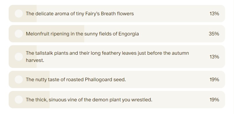The leaves give a brittle shake around you as you squeeze the stalk ever tighter. New vines spring up about your feet causing you to lose your footing, but not your grasp on the wicked plant. The pulsing jewel begins to burn angrily brighter.